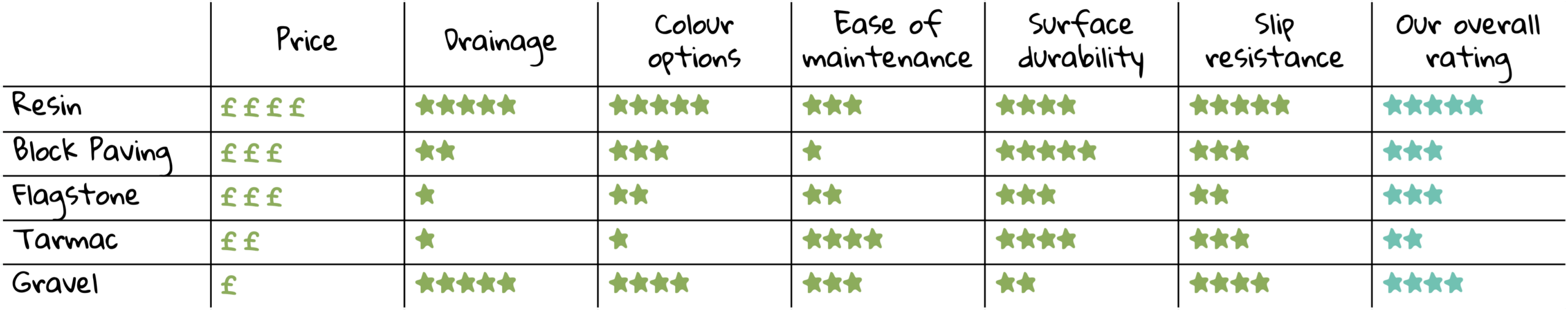 Resin is our top-rated surface, giving you the best drainage and slip resistance along with the widest choice of colours. Block paving is great for durability, making it a tough, decorative option for areas that get a lot of use. Flagstone is solid, dependable choice with a stylish look that stands up well to everyday foot traffic. Tarmac is a very practical, low-maintenance surface that’s built to last, even if the colour choices are a bit limited. Our best-value option is gravel, giving you great drainage, colour and slip resistance without breaking the bank.